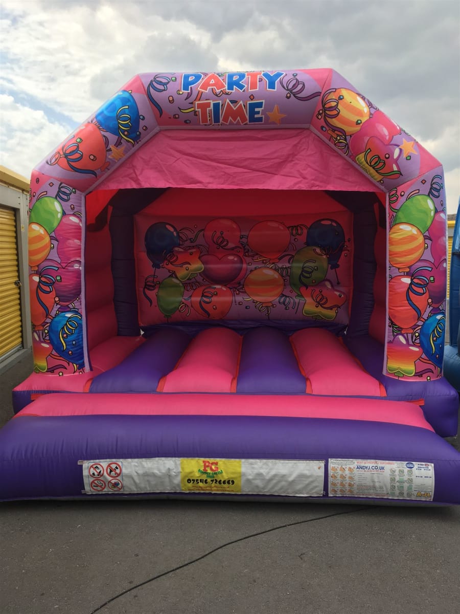 12 ft X 12 ft PINK AND PURPLE PARTY TIME THEMED BOUNCY CASTLE.