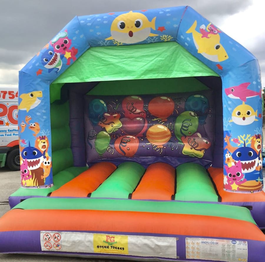 Make a splash with Pg bouncy castle hire 12 ft x 12 ft Baby Shark Bouncy Castle in Widnes, Runcorn, Liverpool, Warrington, St. Helen's, Northwich and Frodsham. 🦈 Bright, safe and family-friendly, this eye-catching bouncy castle turns any party into an underwater adventure. Perfect for birthdays, school fun days, christenings and community events. 🎉