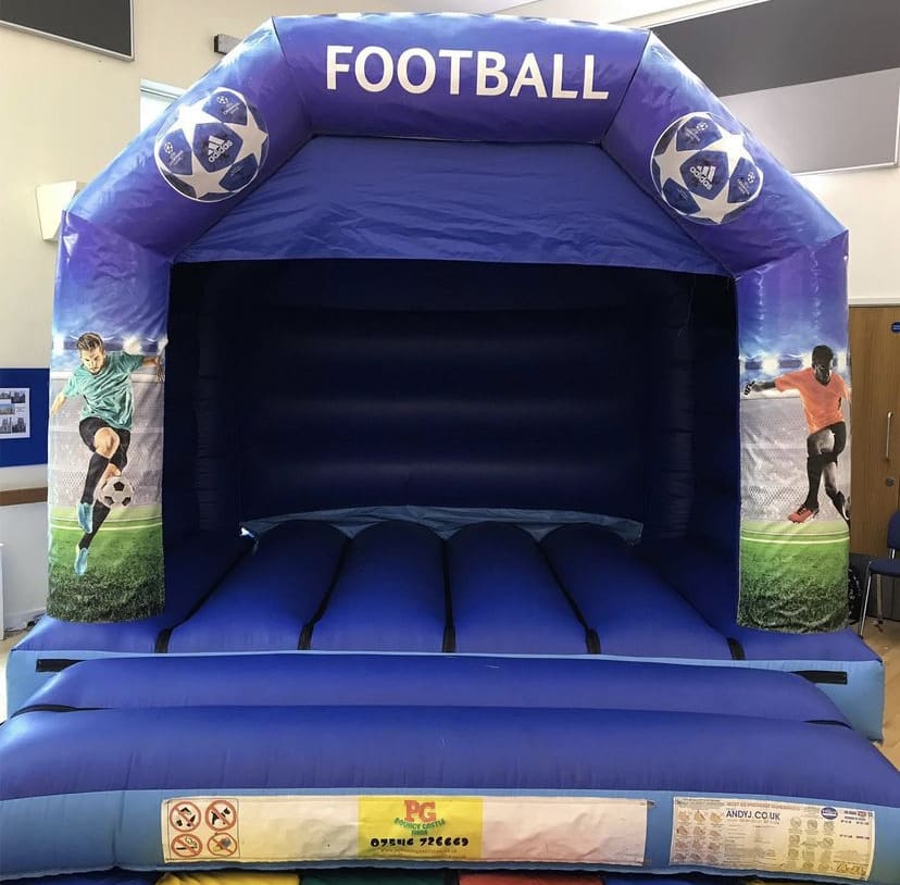 Pg bouncy castle hire 12 ft x 12 ft Football Bouncy Castle in Widnes, Runcorn, Liverpool, Warrington, St. Helen's, Northwich and Frodsham. ⚽️🏰 Make your next party unforgettable with this vibrant blue, Champions League–themed inflatable. Perfect for birthdays, school events, sports days, and family gatherings. Safe, clean, and built to entertain children and football fans alike.