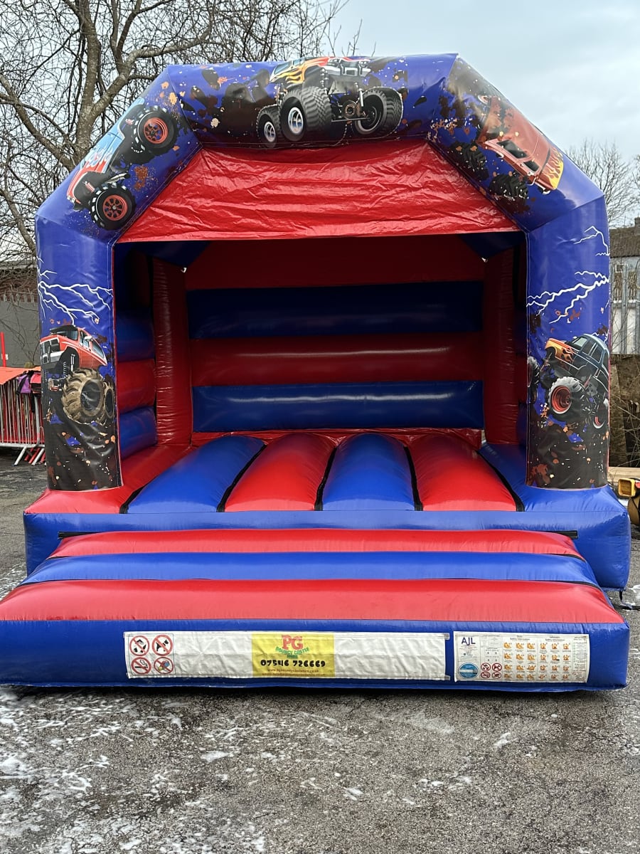 Pg bouncy castle hire 10 ft x 12 ft Monster Trucks Bouncy Castle red & Blue in Widnes, Runcorn, Liverpool, Warrington, St. Helen's, Northwich and Frodsham