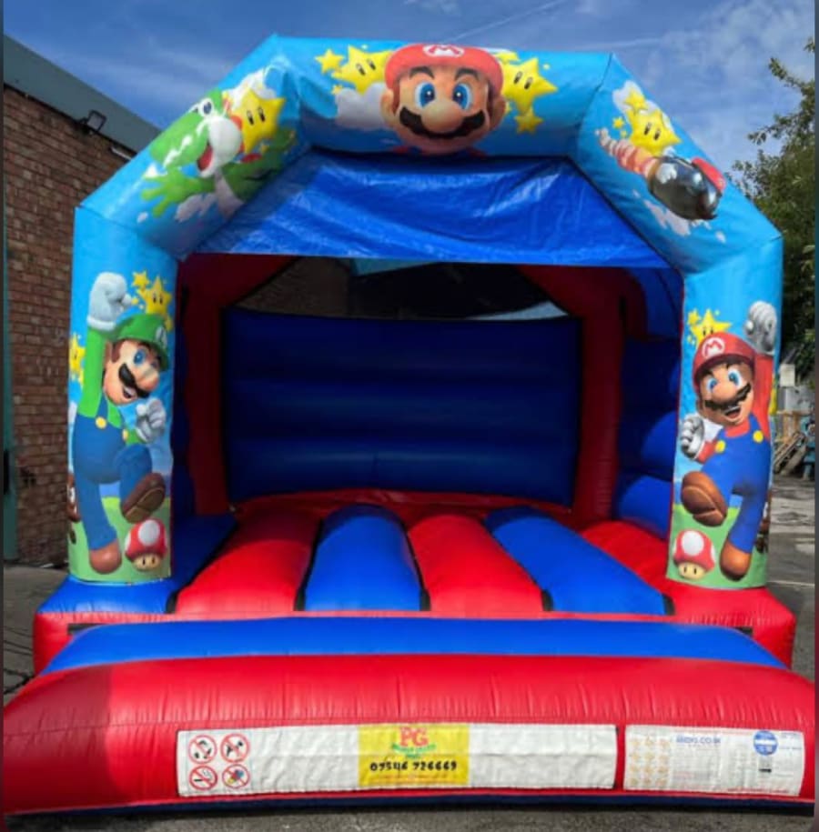 Pg bouncy castle hire 10 ft x 12 ft Super Mario Bros Bouncy Castle Red & Blue in Widnes, Runcorn, Liverpool, Warrington, St. Helen's, Northwich and Frodsham brings classic gaming fun to your next party. 🎉 Bright graphics, durable build and a roomy 10 ft x 12 ft play area make this bouncy castle a top pick for birthdays, school fun days and community events.