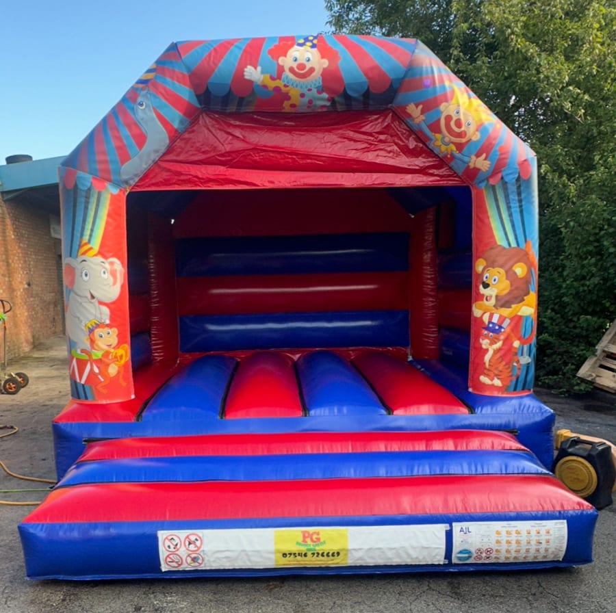 We offer Pg bouncy castle hire 10 ft x 12 ft Circus Bouncy Castle Red & Blue in Widnes, Runcorn, Liverpool, Warrington, St. Helen's, Northwich and Frodsham. Book with confidence for local delivery, setup and pickup. ๐
