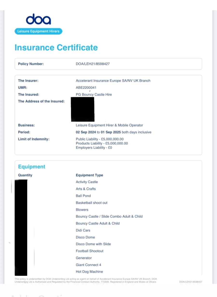 Hear at pg bouncy castle hire we like to do things by the book so hear is our public liability insurance.
