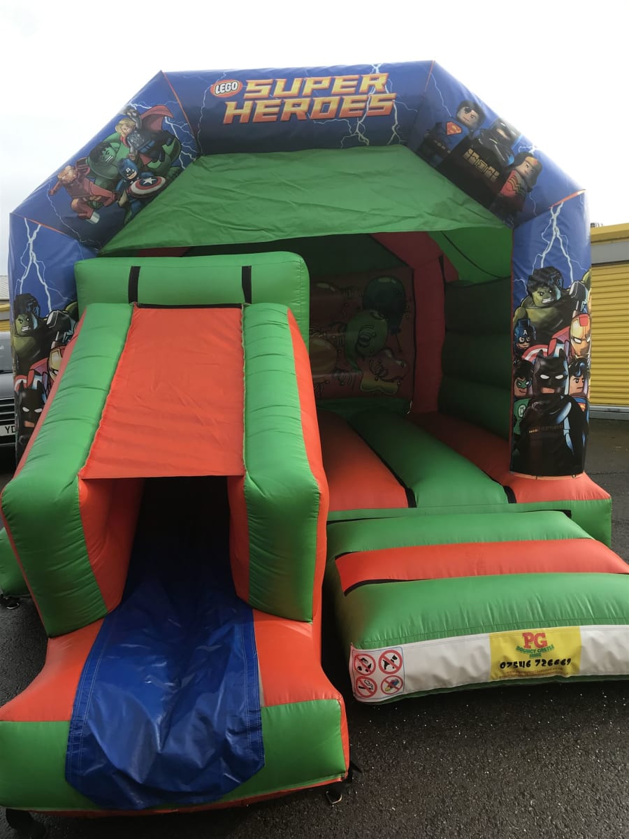 Pg bouncy castle hire 12 ft x 17 ft Superheroes Slide Combo Bouncy Castle in Widnes, Runcorn, Liverpool, Warrington, St. Helen's, Northwich and Frodsham