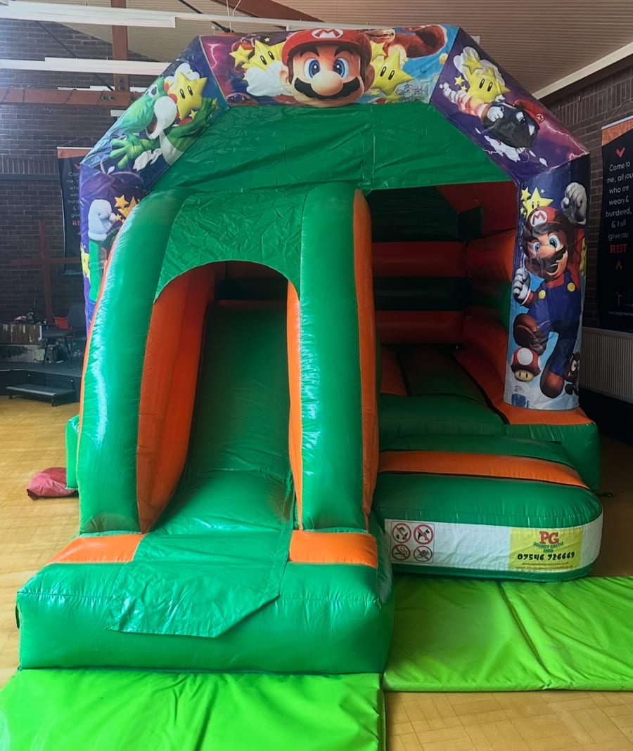 Pg bouncy castle hire 12 ft x 17 ft Mario Slide Combo Bouncy Castle in Widnes, Runcorn, Liverpool, Warrington, St. Helen's, Northwich and Frodsham is the perfect combo for birthdays and community events. This vibrant, themed inflatable packs bouncing, sliding and racing fun into a compact 12 x 17 ft footprint. Ideal for gardens, halls and smaller venues. Clean, insured and reliable — ready for unforgettable memories. ๐