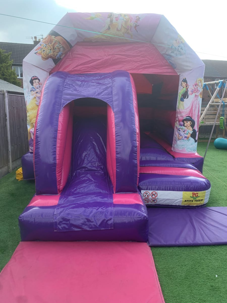 Pg bouncy castle hire 12 ft x 18 ft Disney Princess Slide Combo Bouncy Castle in Widnes, Runcorn, Liverpool, Warrington, St. Helen's, Northwich and Frodsham π°β¨
