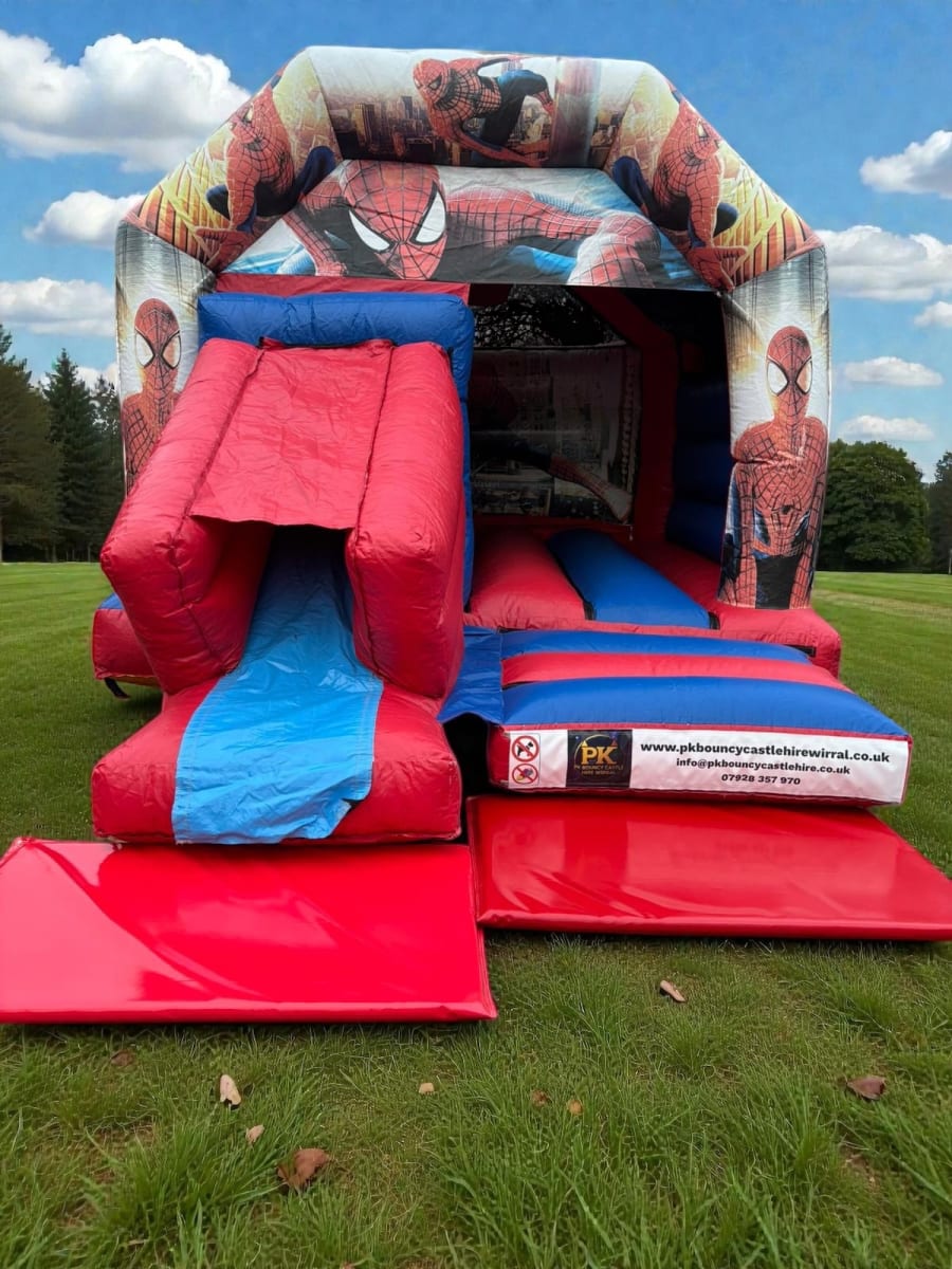 Pg bouncy castle hire 12 ft x 18 ft Spider-Man slide Combo Bouncy Castle in Widnes, Runcorn, Liverpool, Warrington, St. Helen's, Northwich and Frodsham. This red and blue Spider-Man slide combo delivers high-energy fun. Perfect for kids' birthdays, community events, and party jump sessions. Clear Spider-Man art wraps the front visor and back wall inside. Safe, eye-catching, and built to entertain.